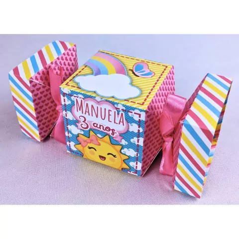 - Formato de caixa Bala personalizado com o tema, o nome e a idade do aniversariante para tornar a lembrança ainda mais especial.